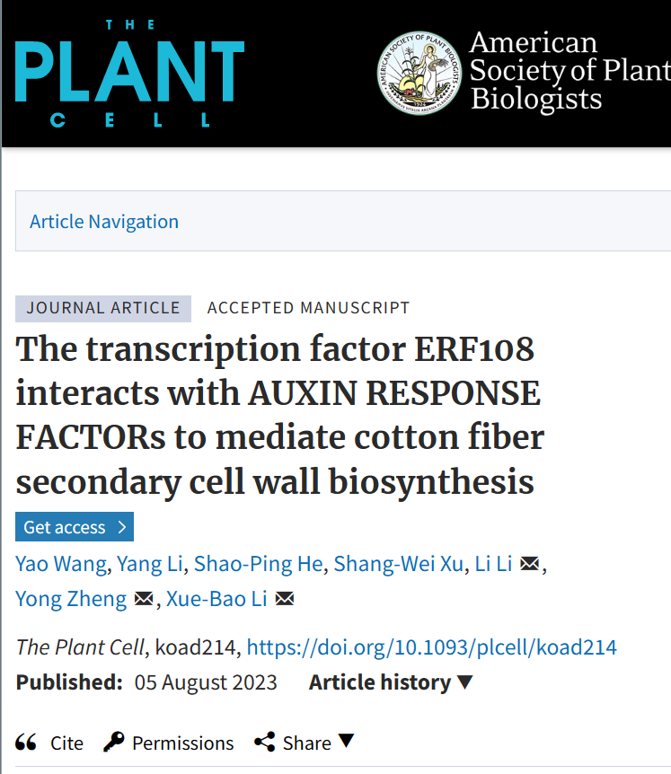 华大在线讯(通讯员 李扬)8月5日,植物学顶级期刊Plant Cell在线发表我校生命科学学院分子遗传研究组题为“The transcription factor ERF108 interacts with AUXIN RESPONSE FACTORs to mediate cotton fiber secondary cell wall biosynthesis” (hppts://doi.org/10.1093/plcell/koad214)的研究论文,该研究揭示了AP2/ERF转录因子GhERF108与生长素响应因子GhARF7-1/7-2通过乙烯-生长素交互信号通路(ethylene-auxin signaling crosstalk)调控棉纤维SCW发育的新机制。
