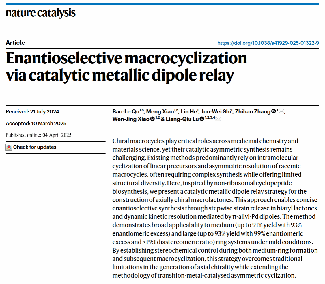 华大在线讯(通讯员 周汉鸣)4月4日,我校化学学院肖文精教授团队在国际顶级期刊《自然催化》(Nature Catalysis)发表题为"催化的金属偶极体接力实现对映选择性大环化"(Enantioselective macrocyclization via catalytic metallic dipole relay)的研究论文。该研究创新性地提出了"金属偶极体接力"策略,为轴手性大环化合物的高效合成开辟了新路径。dajiang.com博士研究生曲宝乐(实验研究)和肖萌(理论计算)为共同第一作者,陆良秋教授和张之涵教授为共同通讯作者,我校为第一完成单位。